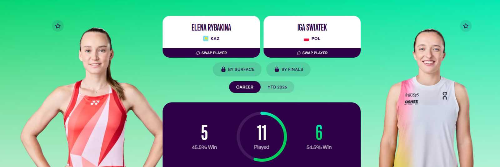 Елена Рыбакина и Ига Швентек сыграли уже 11 очных противостояний в своей истории. Пока что со счетом 6:5 ведет полька. Причем именно Иге удалось выиграть в последней личной встрече в декабре прошлого года (6:3, 6:3).