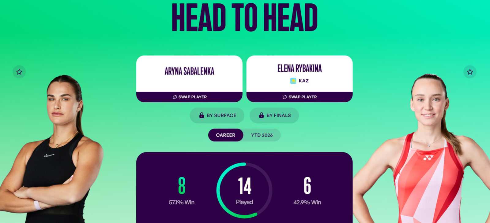 Арина Соболенко и Елена Рыбакина играли между собой уже 14 раз. Пока что со счетом 8:6 в очных встречах ведет белоруска. На открытых кортах с твердым покрытием Соболенко тоже имеет преимущество (5-4). Но Рыбакина выиграла три финальных матча из четырех, включая последнюю их встречу. На итоговом турнире в решающей встрече пятая ракетка планеты со счетом 6:3, 7:6 обыграла свою нынешнюю соперницу. Однако за Ариной финал АО-2023 (4:6, 6:3, 6:4). Причем дважды девушки встречались между собой на ТБШ, и оба раза викторию в трех сетах праздновала белоруска.